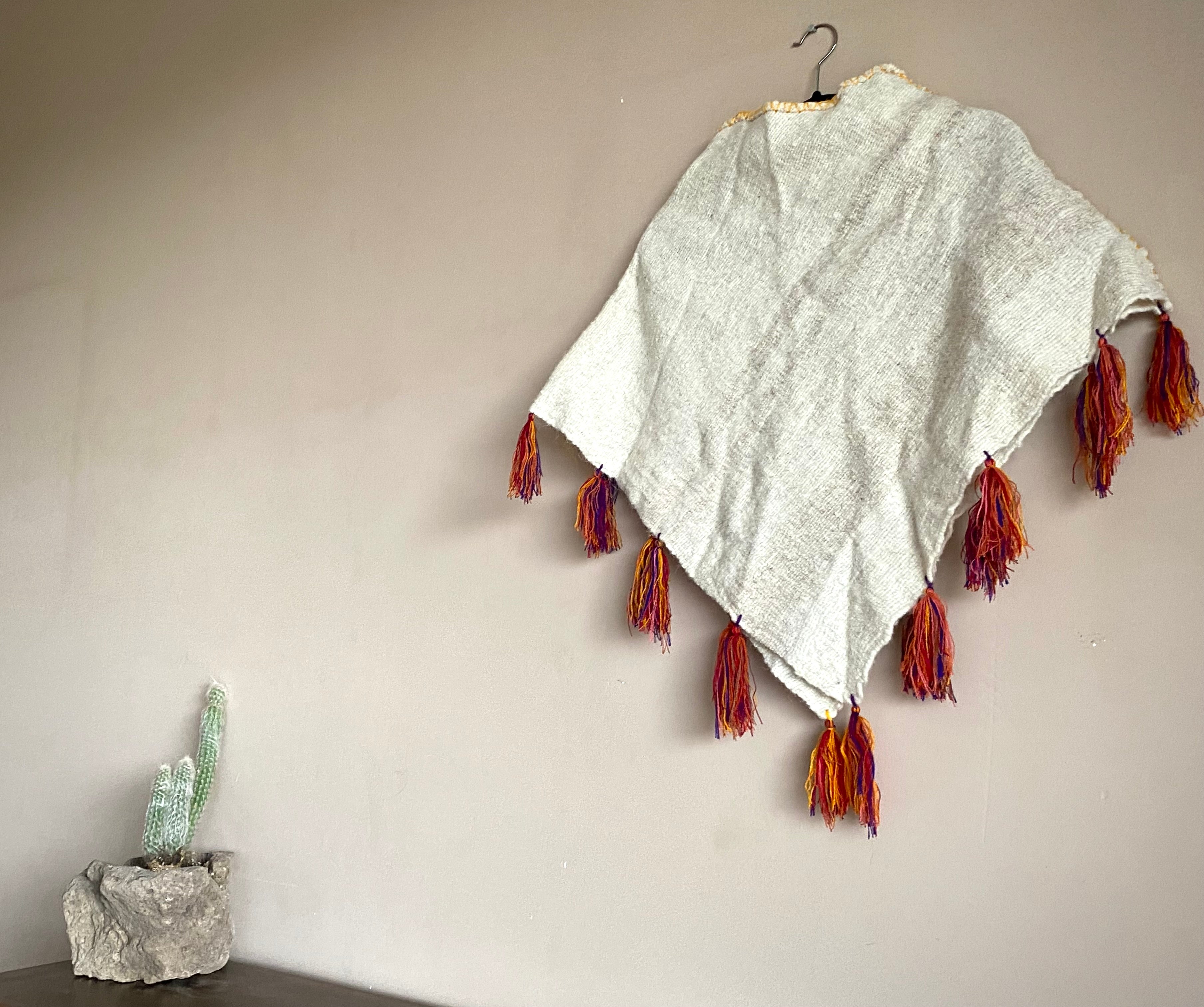 This triangIe edition poncho from Chiapas is caIIed “mañanitas” by the IocaI famiIy of women that makes them.
