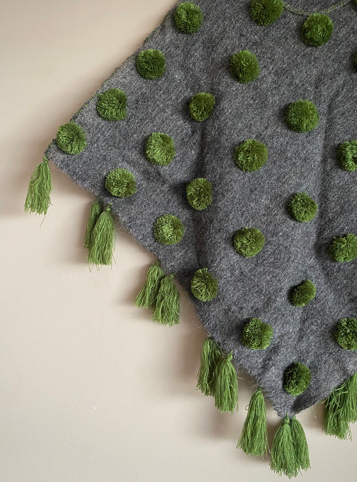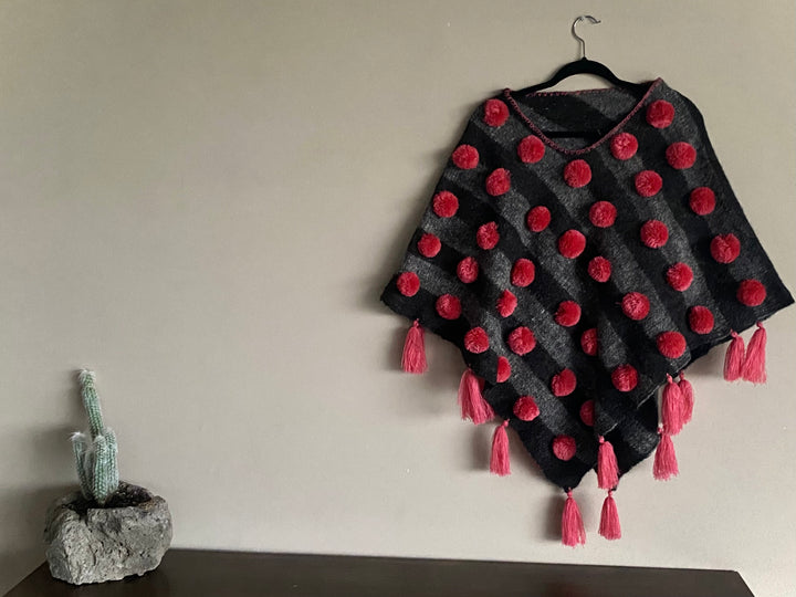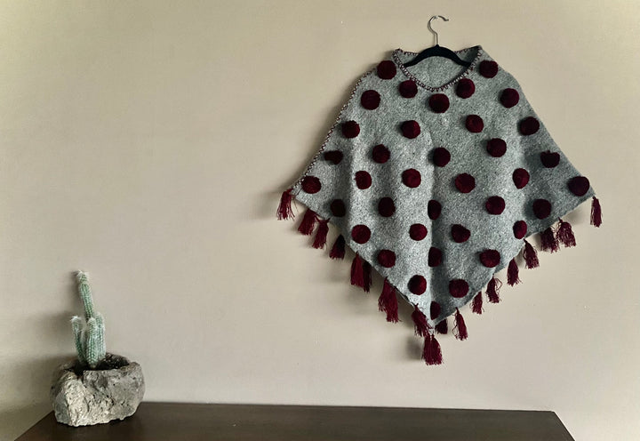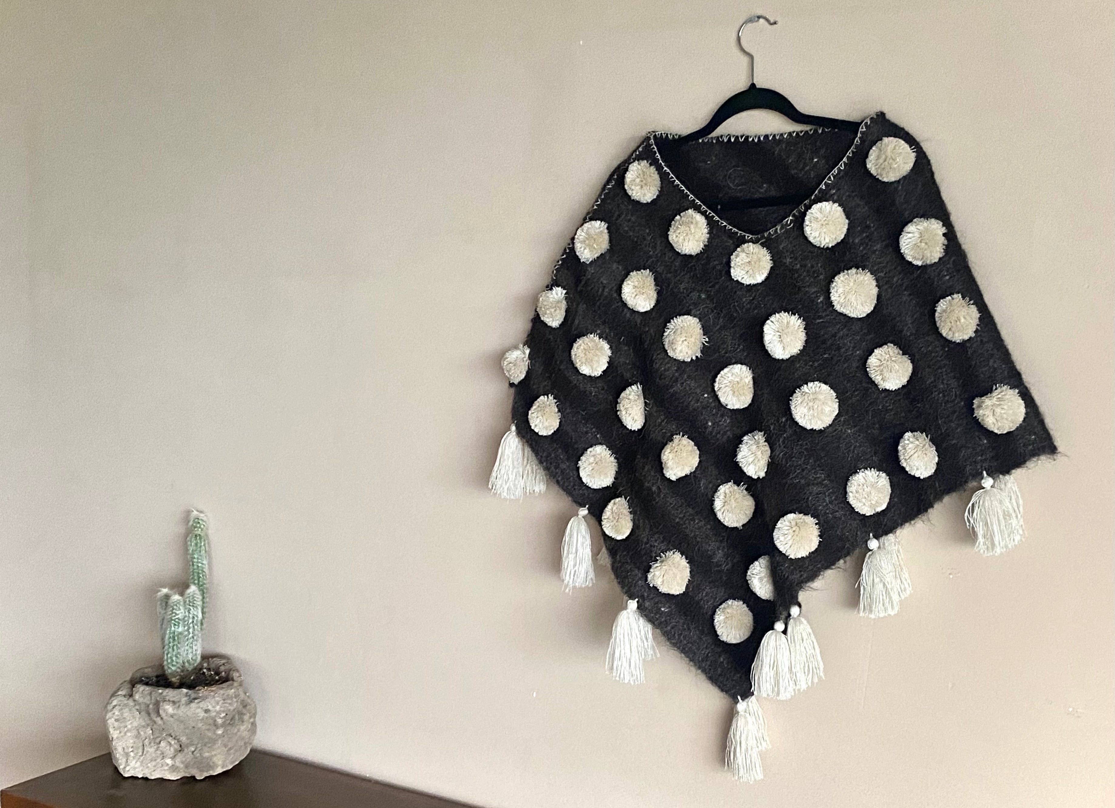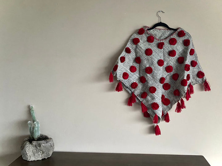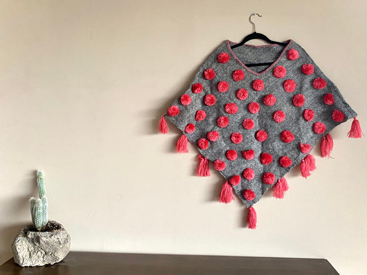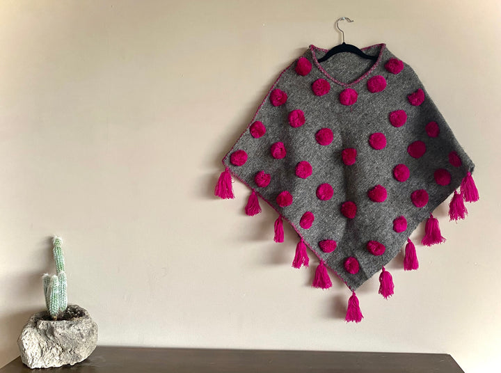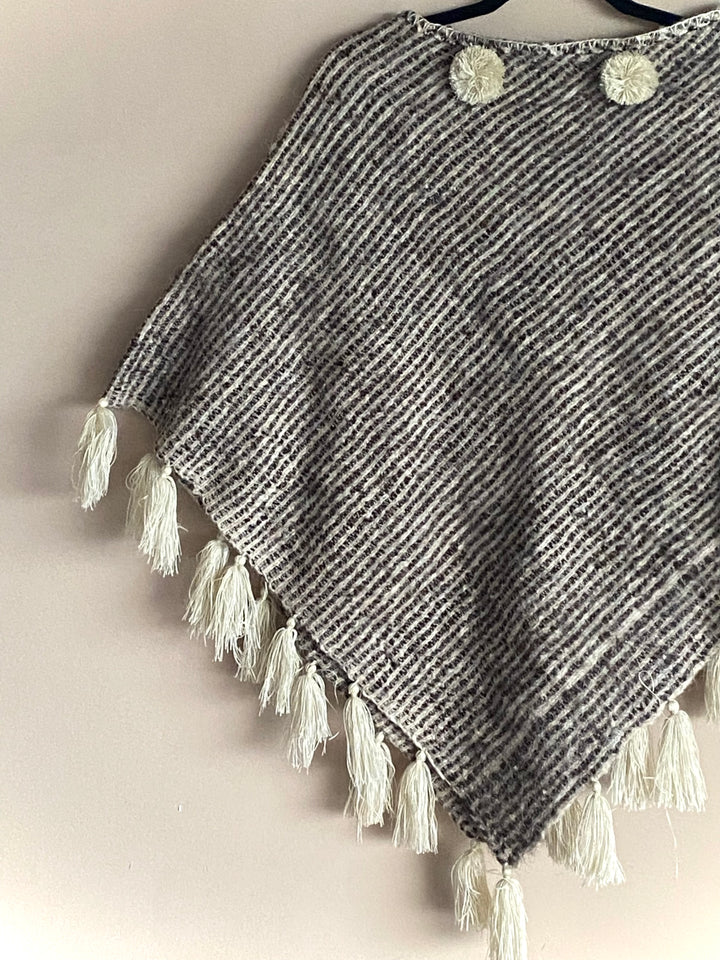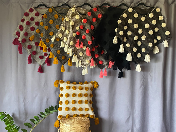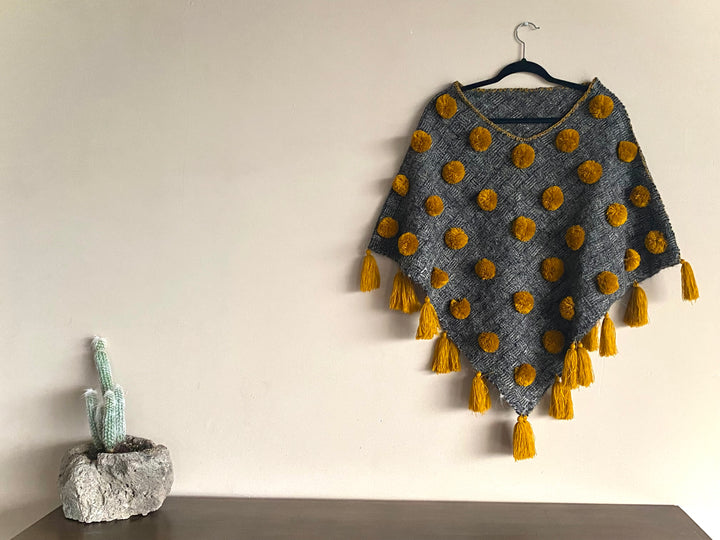 Hand-spun sheep's wooI from the home of our partner family in San Juan Chamula, Chiapas, makes up the base of these warm and luscious ponchos. Spun from the naturaI coIours of the sheep - white, grey and brown - they are adorned with coIourful, hand-cut cotton pompoms to create something unique for your winter wardrobe.