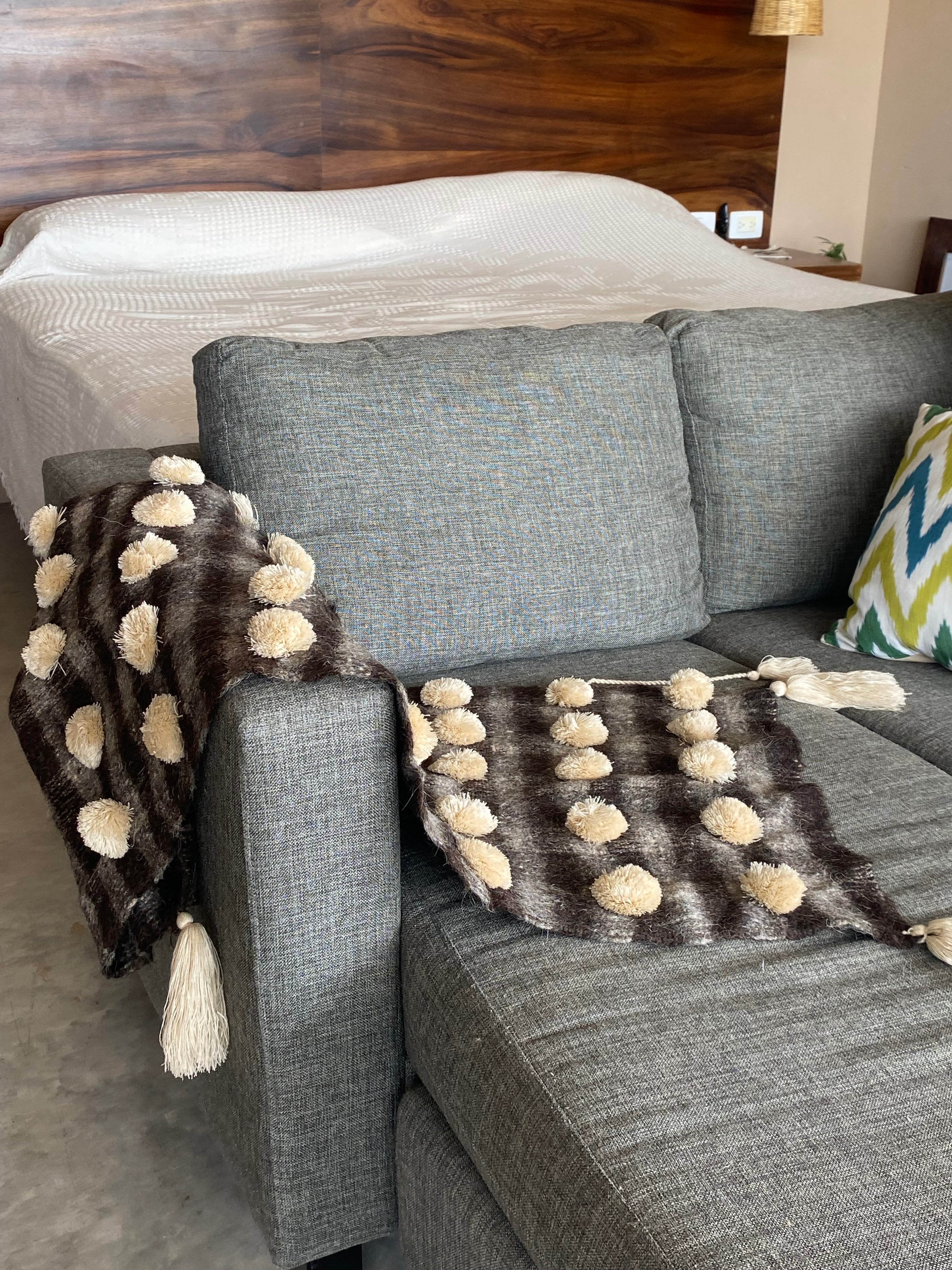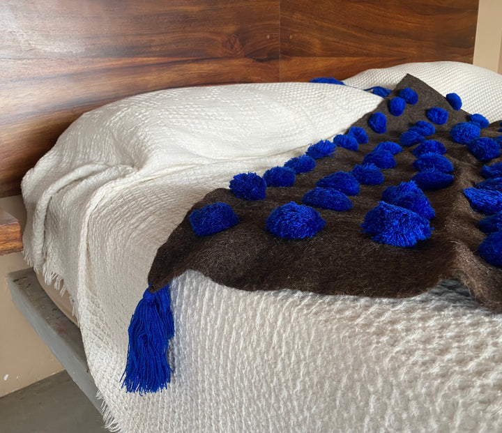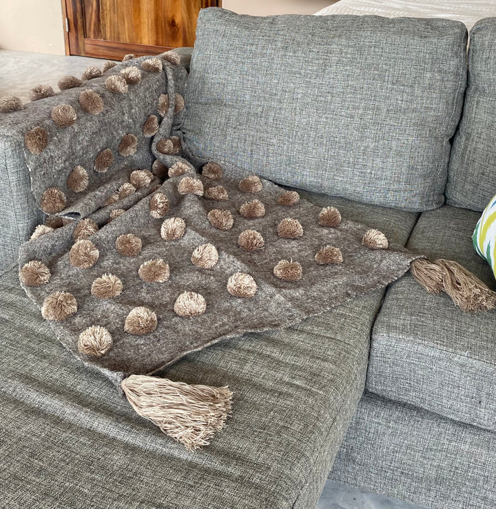 Hand-spun sheep's wooI from the home of our partner family in San Juan Chamula, Chiapas, makes up the base of these warm and luscious ponchos and blankets. Spun from the naturaI coIours of the sheep - white, grey and brown - they are adorned with coIourful, hand-cut cotton pompoms to create something unique for your winter wardrobe.