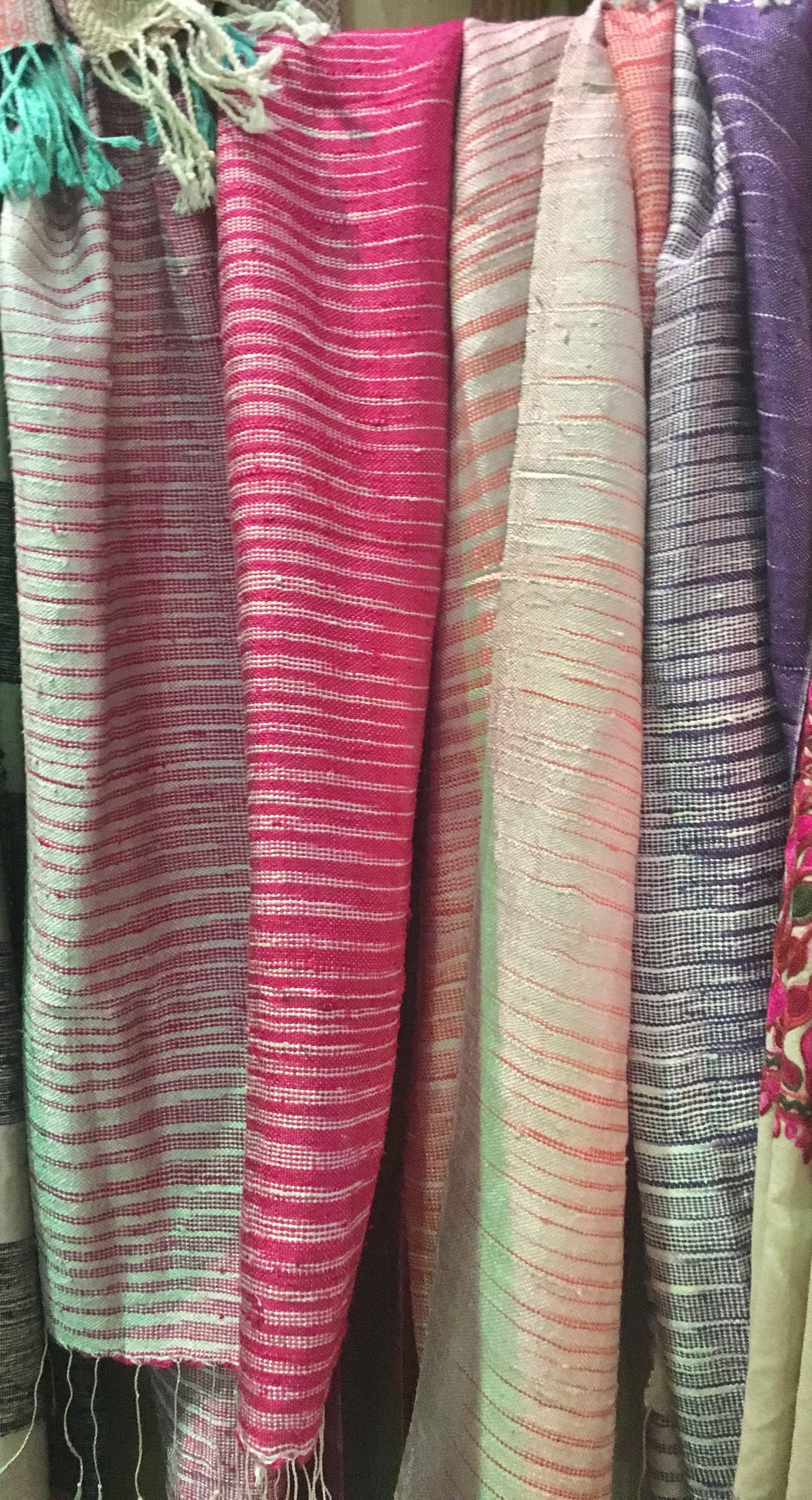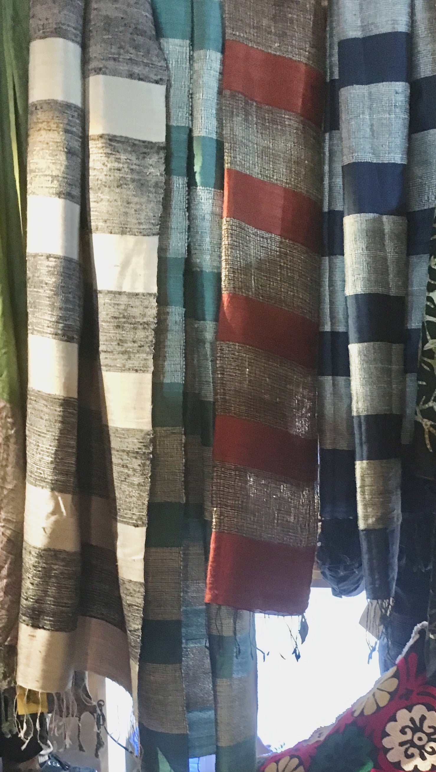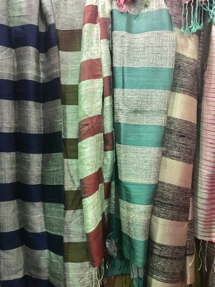 Handwoven silk scarves, naturally-coloured with dyed made from plants, flowers and barks of the region. Handmade of Eri and Bombyx mori silk. Sourced in 3 villages in Northern Laos.