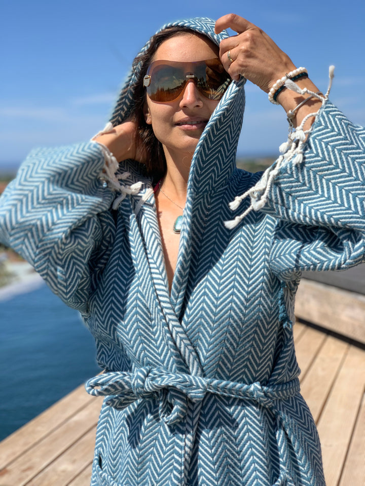 An overcoat for indoors and out. The Shepherd's Robe ZICKZACK is made of two-and-a-half fine Turkish towels. It is equally cozy as it is practical - at the beach, in the sauna or at home. Dry yourself off, cover up or warm yourself up with timeless style.
